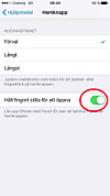Gå in på Inställningar >> Allmänt >> Hjälpmedel >> Hemknapp >> och klicka i ”Håll fingret stilla för att öppna”.